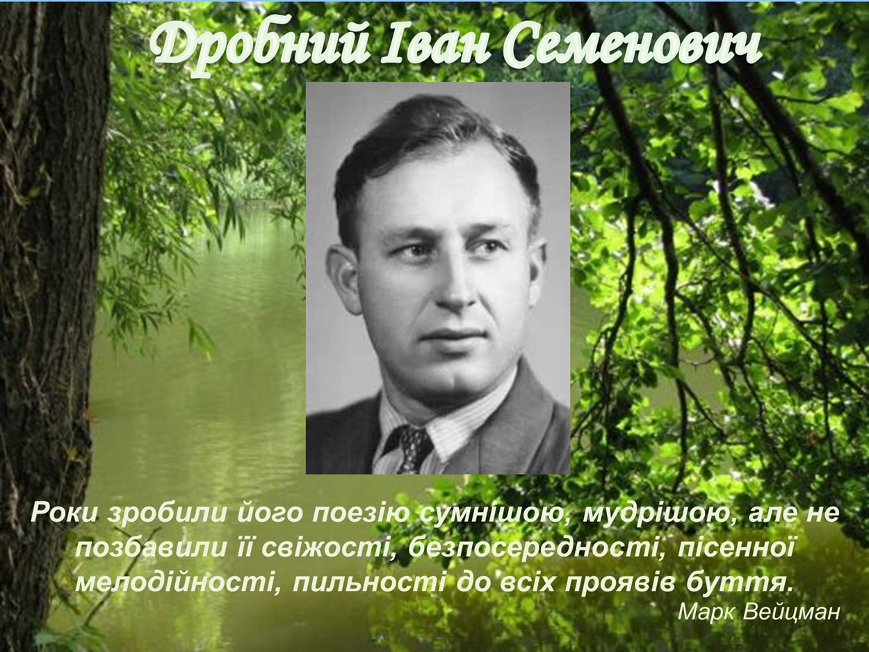 Зважаючи на неабиякий інтерес до всього українського викладачів – керівників проєкту, я запропонував Юлії цікавий матеріал, пов’язаний із життям і творчістю Івана Семеновича Дробного, літературну діяльність якого високо цінять на Золотоніщині, Черкащині, в усьому світі. Мій вибір не був випадковим, адже працюючи у ВСП «Золотоніський фаховий коледж ветеринарної медицини БНАУ» викладачем української мови та літератури, неодноразово організовував разом із районною бібліотекою творчі зустрічі із Іваном Дробним, учасниками яких були студенти нашого навчального закладу, викладачі, працівники краєзнавчого музею тощо. Свого часу, проходячи курси підвищення кваліфікації при Черкаському обласному інституті післядипломної освіти педагогічних працівників, я приготував презентацію «Іван Дробний. Поет Золотоніщини», яка збереглася у каталозі цифрових ресурсів ЧОІПОПП, а тепер могла стати в пригоді.