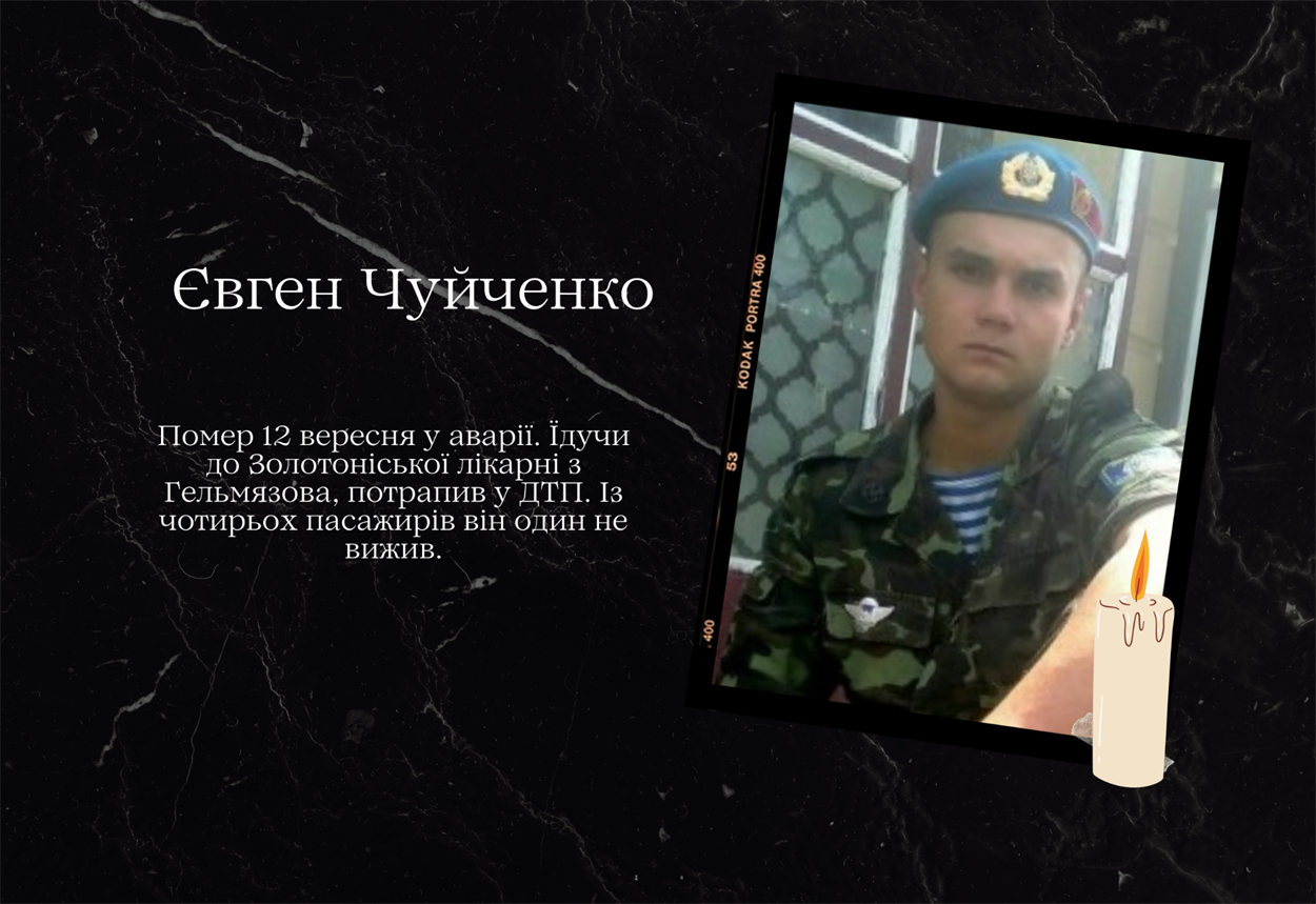 Та смерть, яка не дістала хлопя в АТО, наздогнала його у безглуздій аварії. Їдучи до Золотоніської лікарні з Гельмязова, Чуйченко потрапив у ДТП. Із чотирьох пасажирів він один не вижив.