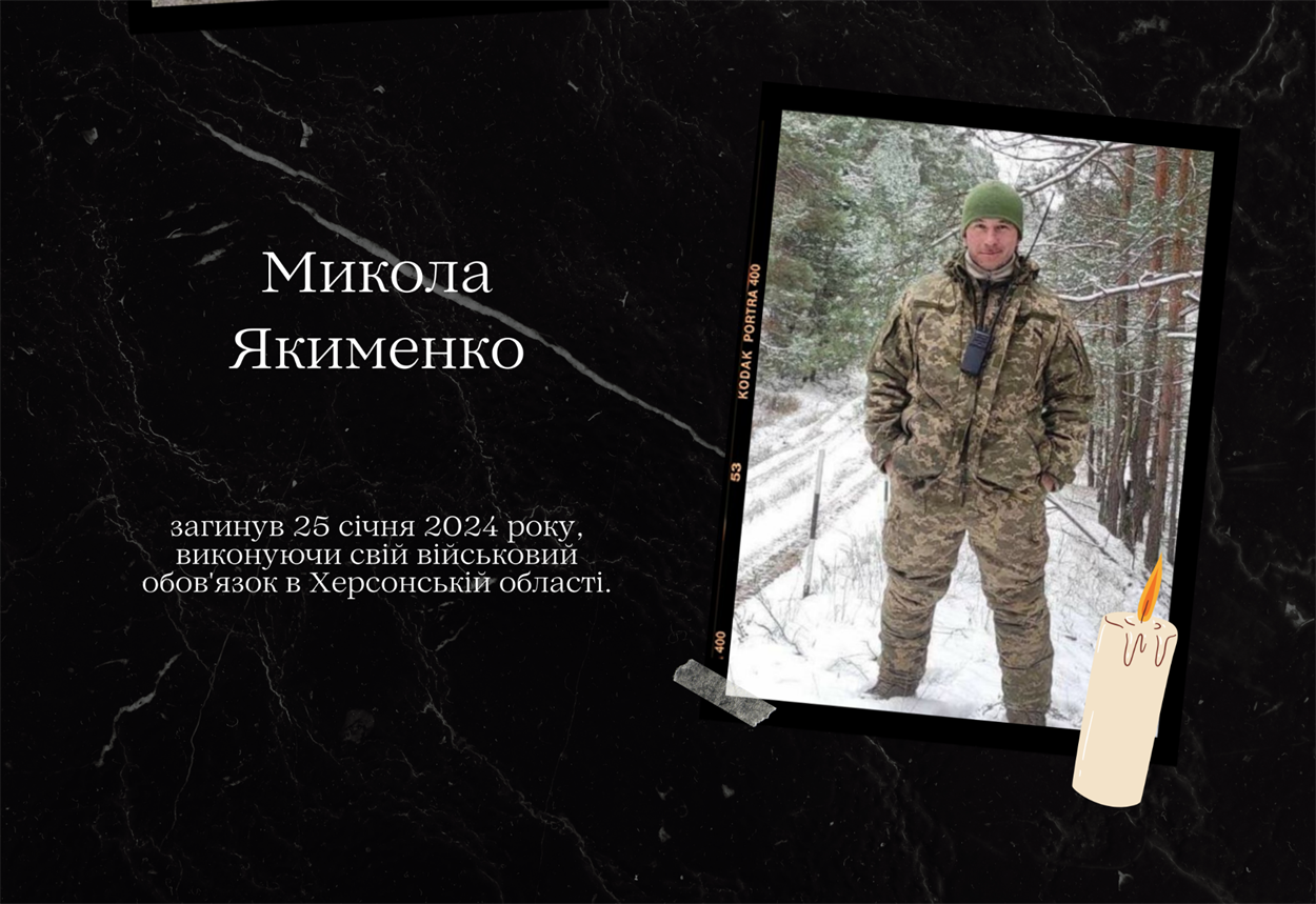 Сумна втрата великого чоловіка, батька та захисника родини і Батьківщини – Миколи Васильовича Якименка, який загинув 25 січня 2024 року, виконуючи свій військовий обов'язок в Херсонській області.