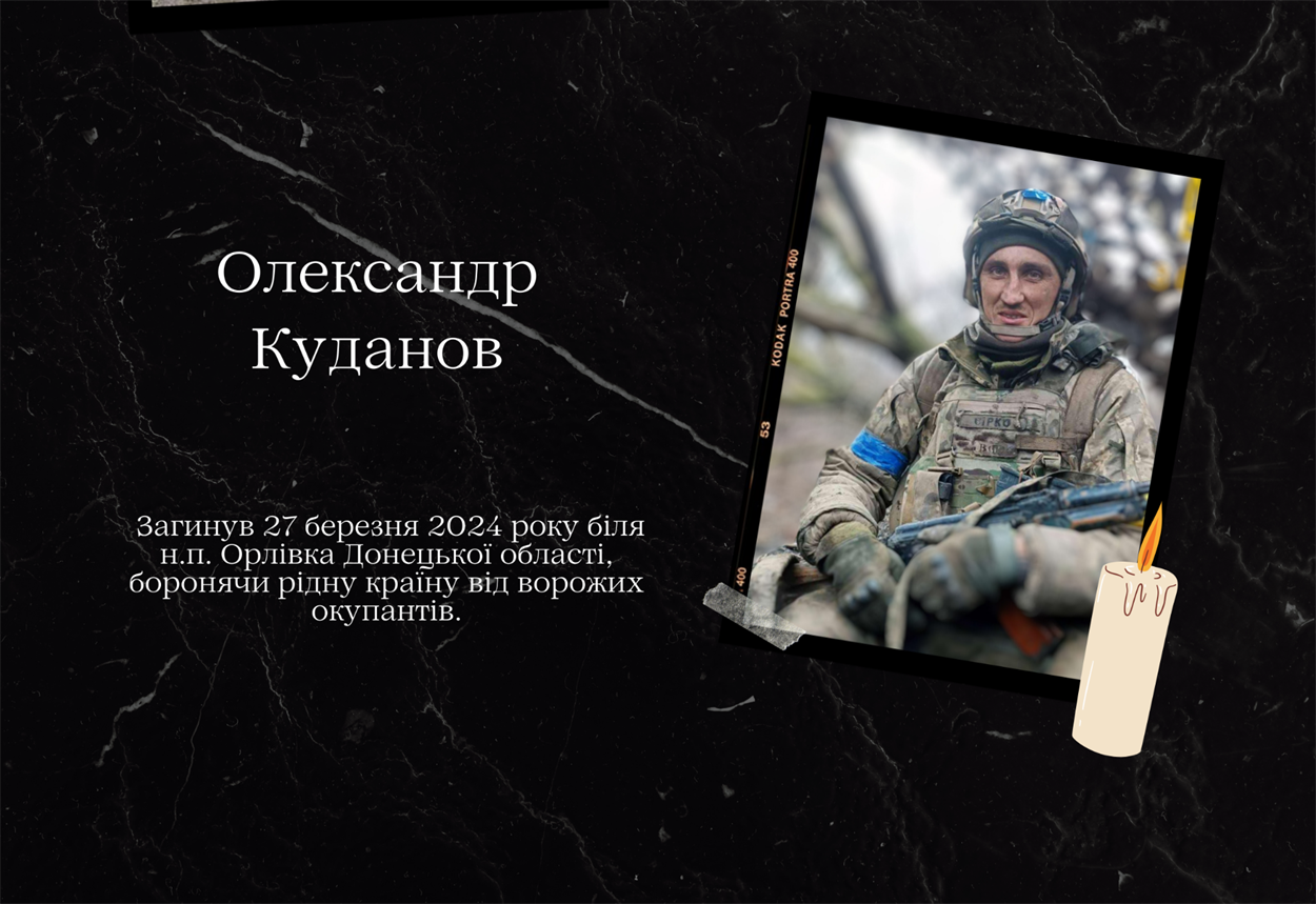 27 березня 2024 року від нас у засвіти пішов золотоніський герой Олександр Куданов. Він загинув в боротьбі за незалежність та суверенітет України, поклав своє життя на вівтар боротьби за мир і свободу. Йому було всього лише 40 років.