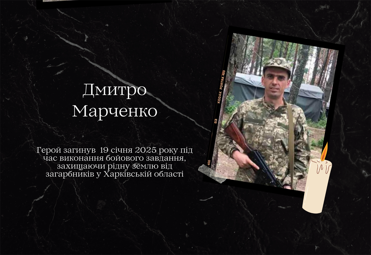 З сумом та скорботою повідомляємо, що 19 січня 2025 року під час виконання бойового завдання, захищаючи рідну землю від загарбників у Харківській області, загинув наш земляк, солдат Дмитро Миколайович Марченко, народжений 17 червня 1990 року.