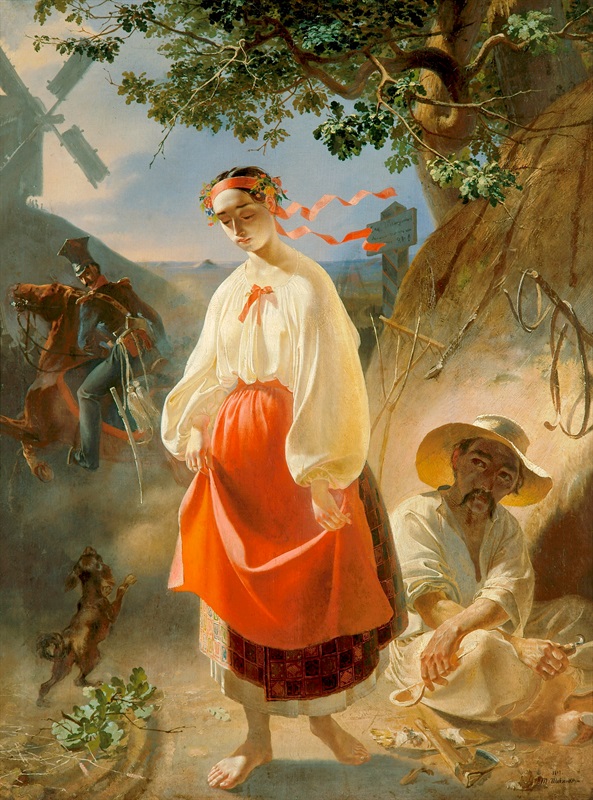 Споглядаючи цю картину, немов знову перечитуєш увесь твір. Тут і зраджена Катерина, і підло втікаючий москаль. А чи помітили ви, як образ Катерини схожий на образ… Мадонни Рафаеля? Такі ж босі ноги, одяг, що огортає стан. А сама вона немов світиться якимось дивним світлом. Це образ не лише скривдженої дівчини, а й Матері, що дає нове життя. До речі, ім’я Катерина означає «чиста, непорочна».