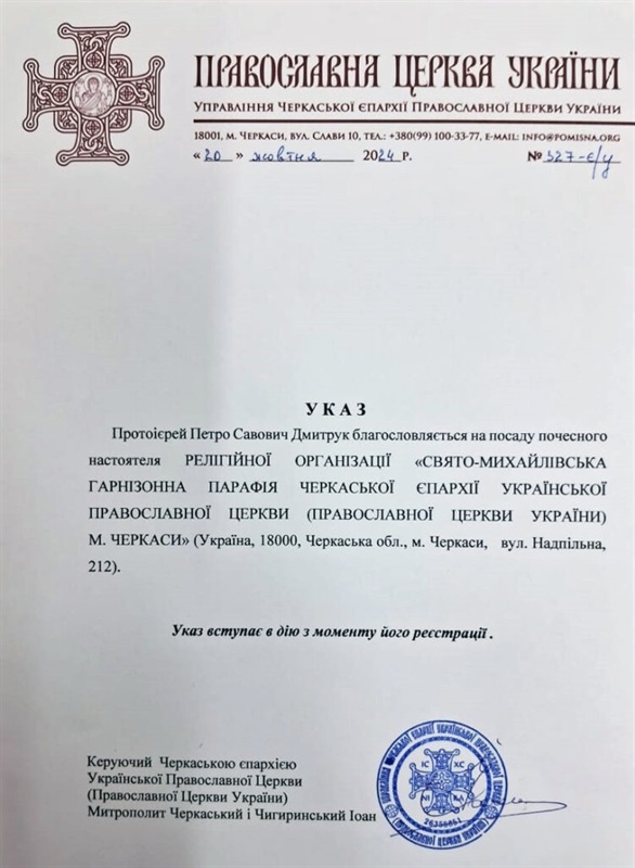 24 жовтня 2024 року в Черкасах відбулося важливе призначення: протоієрей Петро Дмитрук, старший брат спочилого митрополита Софронія, став почесним священником Свято-Михайлівського кафедрального гарнізонного собору. Цю новину підтвердив митрополит Іоан, який підписав відповідний указ, вшановуючи значний внесок митрополита Софронія у розвиток українського православ’я та храмобудівництва.
