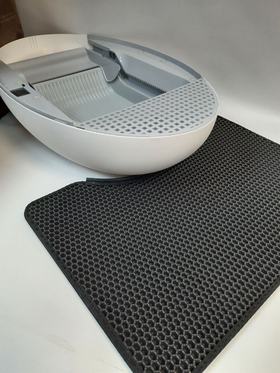- Розмір має відповідати габаритам лотка та враховувати простір, який кіт займає під час виходу з нього. Рекомендується, щоб він виступав за межі на 10–15 см з кожного боку. Це забезпечить ефективне збирання залишків наповнювача з лапок тварини. Наприклад, для стандартної моделі розміром 40×30 см підійде килимок розміром 60×50 см.