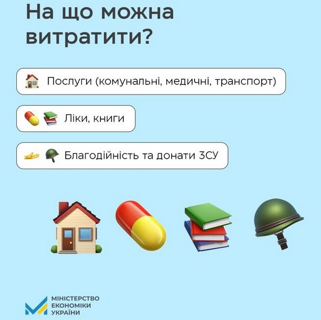 Гроші можна буде витратити на оплату українських товарів та послуг, зокрема комунальних, а також українських ліків, залізничних квитків, українських книг, донату для ЗСУ.