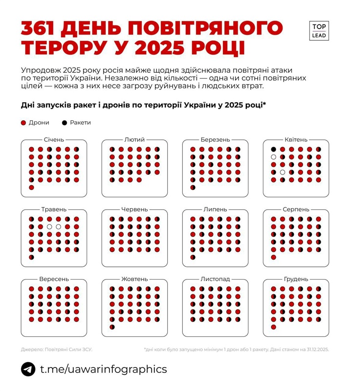 Дані наведені UA War Infographics станом на 31 грудня 2025 року. За основу взято інформацію Повітряних сил ЗСУ. У підрахунок включені дні, коли було зафіксовано щонайменше один запуск дрона або ракети.