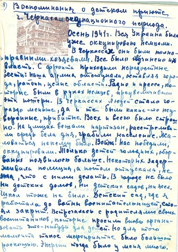 «У 1942 році мою маму, дідуся, бабусю та дядька привезли із с. Тубільці Київської області в Черкаську тюрму. Мою матір, яка тримала мене на руках, бабусю, дідуся, дядька поставили біля стінки для розстрілу. Одна жінка підбігла й забрала мене. Пролунали постріли. Усіх моїх родичів розстріляли. Відтоді в мене з’явилася моя мама, Олександра Шулежко, яка привела мене в притулок…».