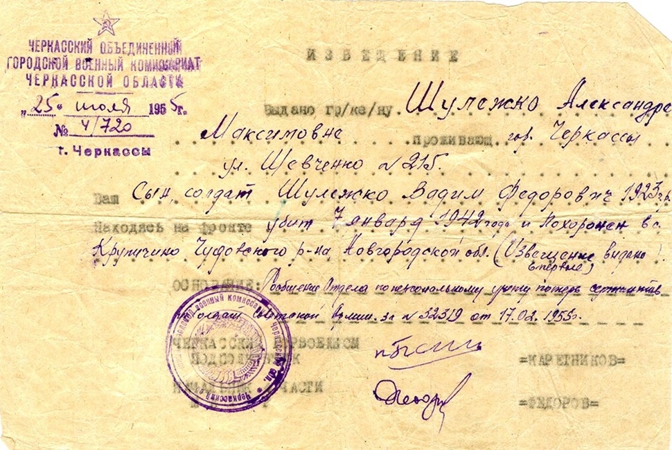 Олександра Максимівна відчайдушно розшукувала сина Вадима. У 1941 р. його мобілізували до лав Червоної армії, упродовж усієї війни жодних звісток про себе він не надсилав. Лише влітку 1955 р. мати отримала сповіщення про загибель 19-річного сина. 7 січня 1942 р. на р. Волхов Ленінградської області 2-га армія за перші півгодини наступу втратила вбитими і пораненими 3 тис. бійців. Серед них був і Вадим Шулежко.