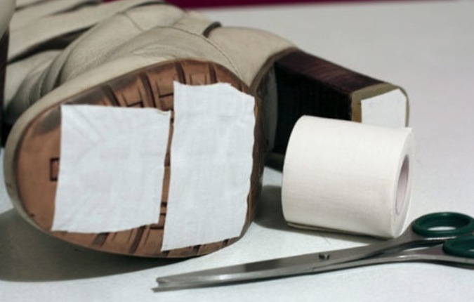 Тканинний медичний лейкопластир чудово зменшує ковзання по льоду. Приклейте дві довгі смужки на підошву взуття вздовж її довжини. Ефект буде помітним одразу, але врахуйте, що волога може швидко відклеїти пластир.