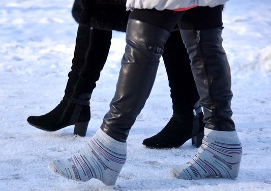 Якщо вас застала ожеледиця без підготовки, скористайтеся звичайними шкарпетками. Надягніть їх поверх взуття - це створить додаткове зчеплення з поверхнею. Спосіб підходить для короткочасних прогулянок.