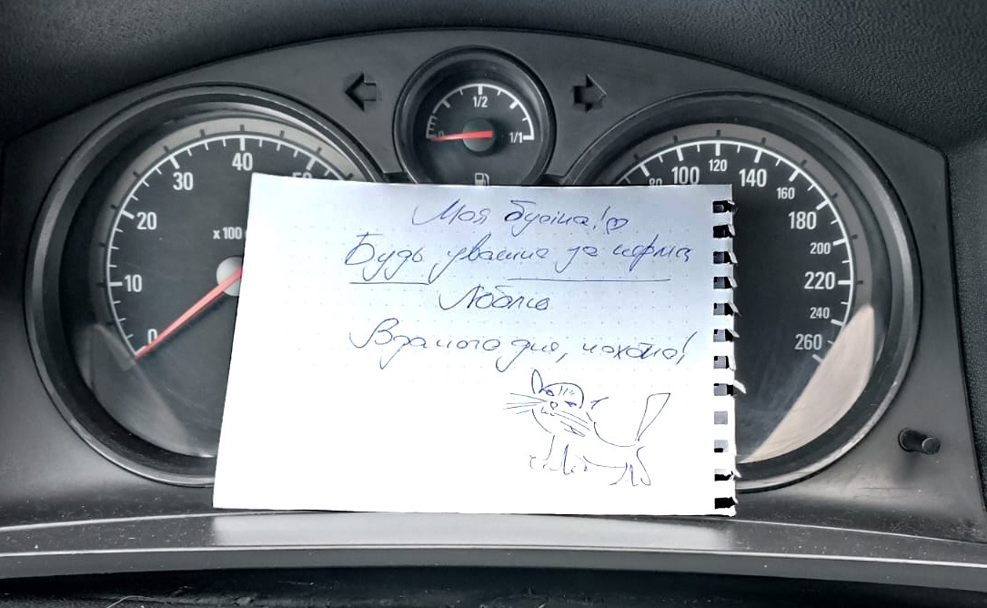 Вранішня записка від чоловіка Максима (військовослужбовець 156 зенітно-ракетного полку), залишена на торпеді авто, — тихий прояв любові і турботи. Це ніжне послання, я на двісті відсотків переконана, зробило вдалим не лише день дружини, а й усіх, хто його прочитав.