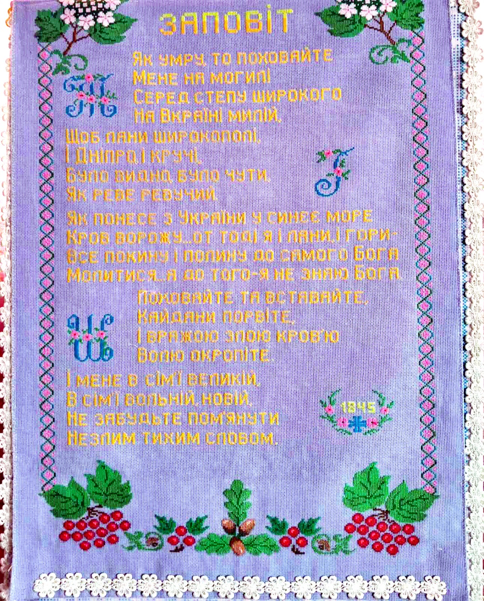 - Коли я вишивала картину «Реве та стогне Дніпр широкий», то не мала на меті показати, який наш Дніпро широкий чи які у нього високі хвилі, - поділилася Антоніна Луківна. – я хотіла, перш за все, донести, що Дніпро – це жива артерія України. Тому вставила у вишивку отой куточок з річковими рослинами. У центрі картини «У нашім раї на землі» вишила українку з немовлям на руках, по обидва боки – пейзажі: з одного – Закарпаття у снігу, з іншого –сонячний Херсон, а позаду – Дніпро. Отака наша Україна! А ось картина «Думи мої, думи мої». Бачите, ось біля цього старого дерева вишила молодий пагон, це – майбутнє нашої країни. Вірю, що вона буде обов`язково щасливою і про це Бога молю. Я людина глибоко віруюча. На жаль, вже не можу тепер ходити до церкви Святителя Луки Кримського, що на території лікарні. Боюся не вистояти службу. Я вважаю, що у церкві треба молитися тільки стоячи, сидячи – не визнаю, тому тепер молюся дома.